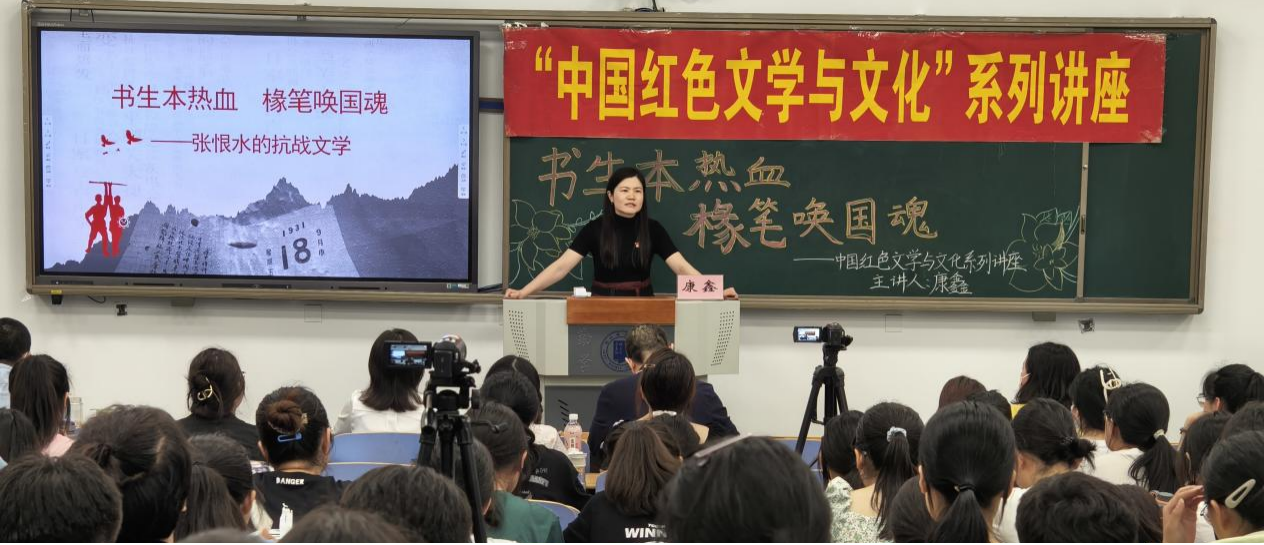 5月17日晚,suncitygroup太阳新城“中国红色文学与文化”系列讲座第九讲开讲,康鑫副教授作了题为“书生本热血,椽笔唤国魂——张恨水的抗战文学”的讲座,公司党委副书记张艳主持,中国现当代文学党支部教师代表、辅导员老师、2022级本科生200余人参加了讲座。
